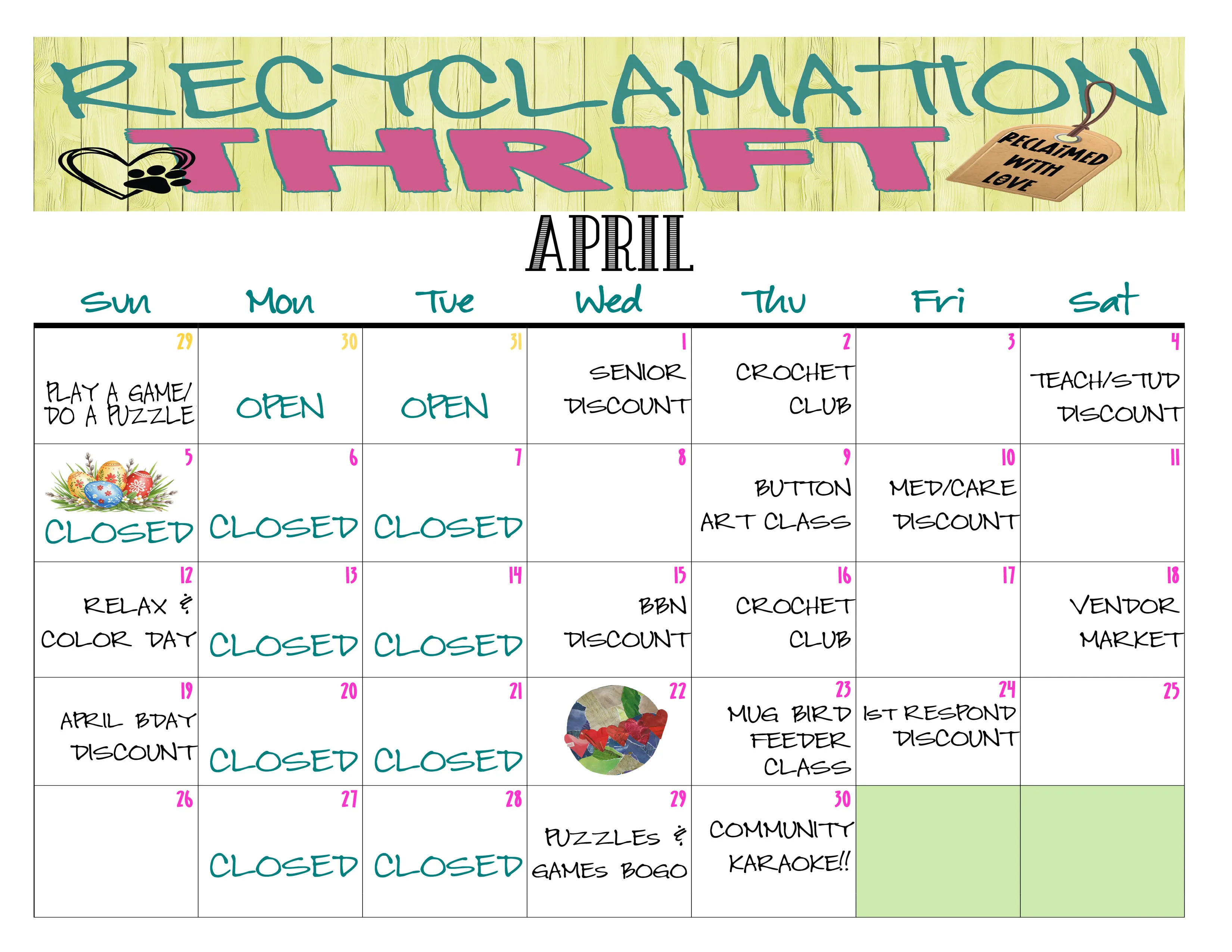 Located in Windsor, North Carolina, RECYCLAMATION is part thrift store, part curiosity shop, part community gathering place. You’ll find clothing, home décor, vintage treasures, practical everyday items, handmade goods, creative workshops, and monthly special events.